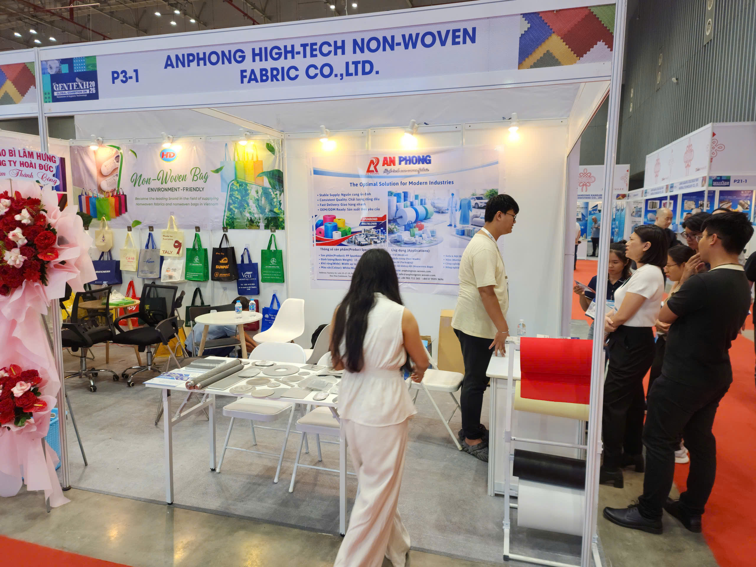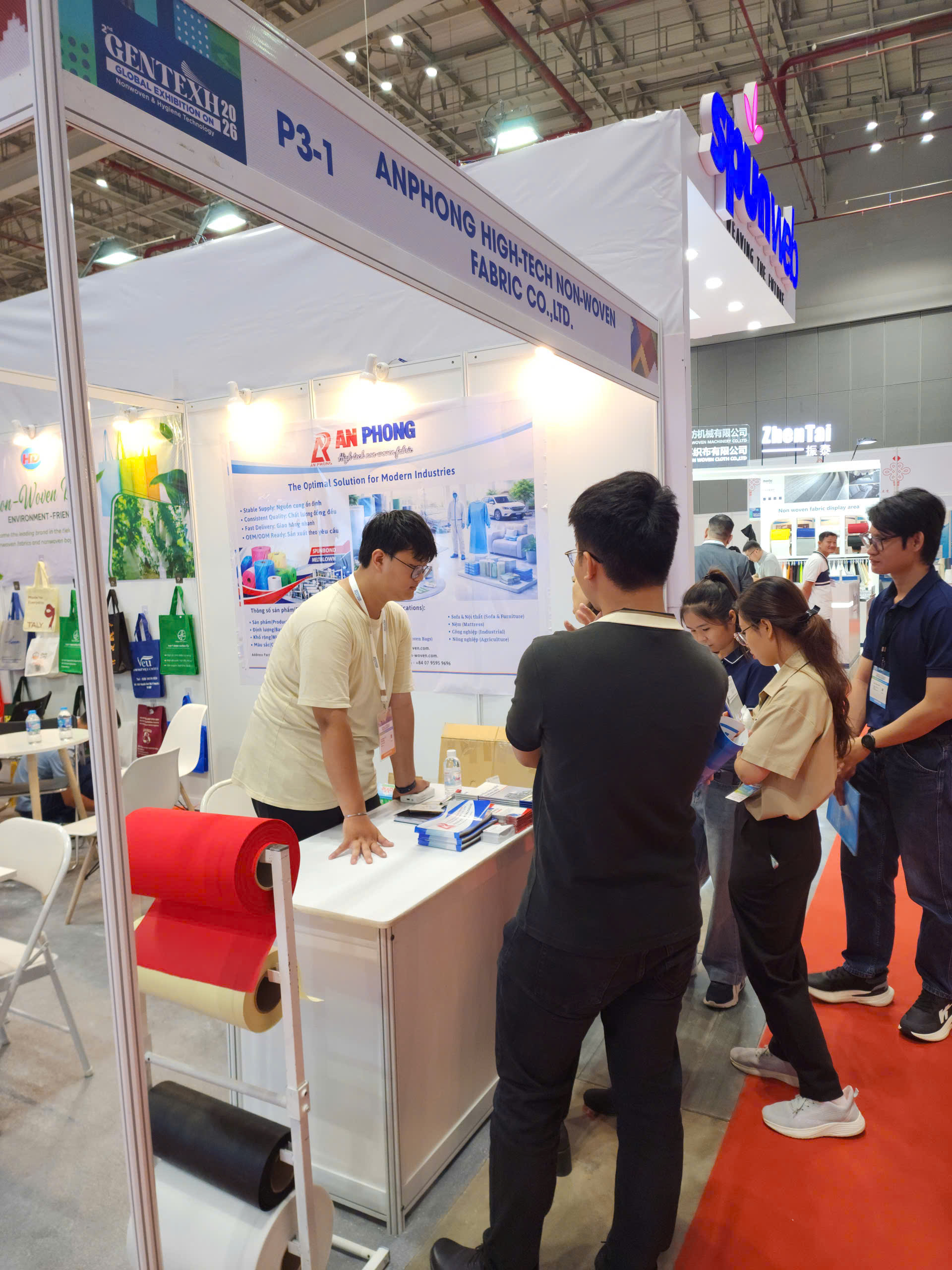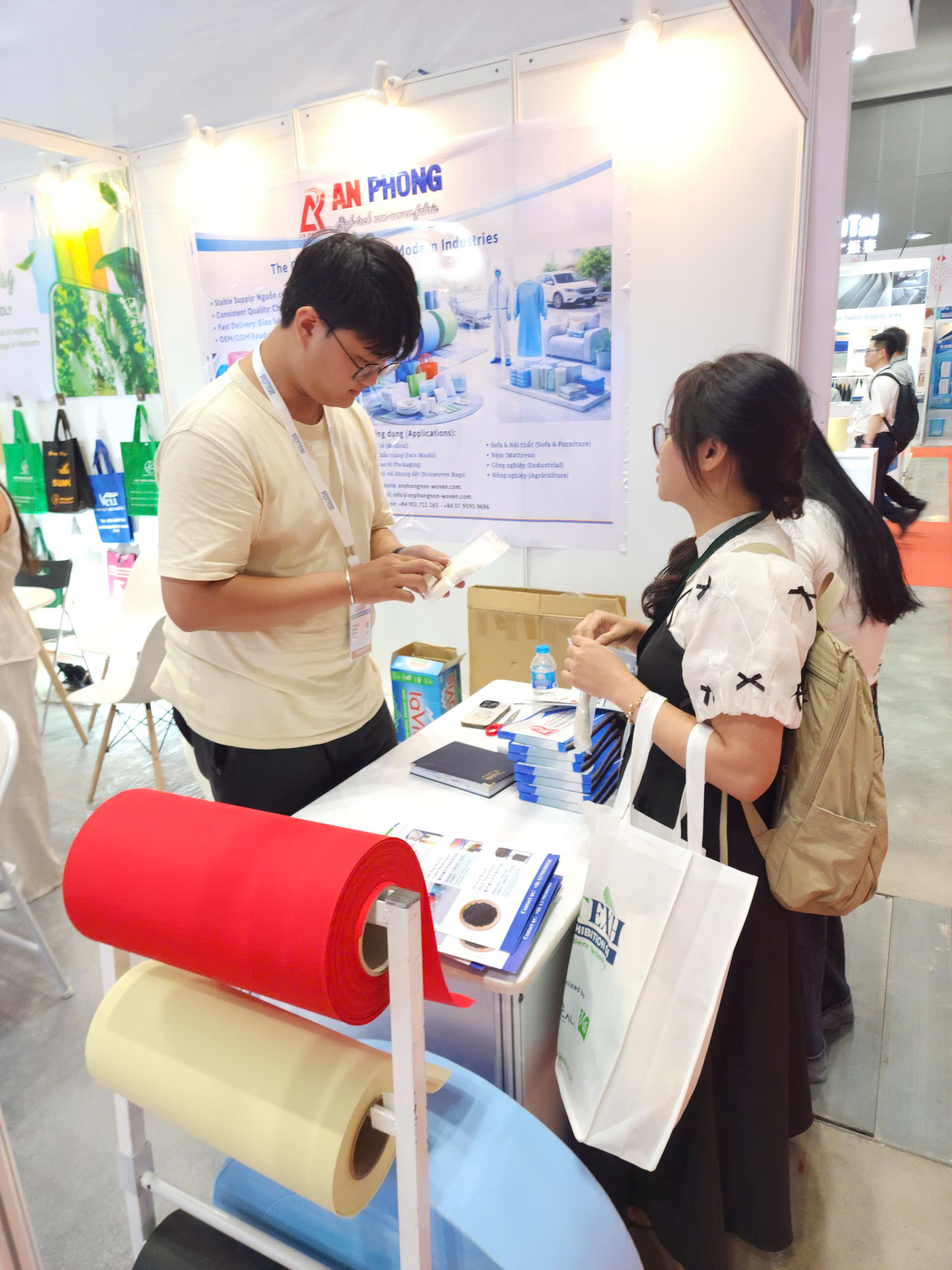 Tại gian hàng P3-1, An Phong đã tập trung giới thiệu dòng sản phẩm chủ đạo: Vải không dệt kỹ thuật cao ứng dụng trong sản xuất Sofa và nệm.